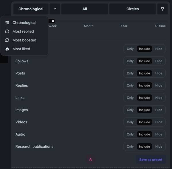 Other fediverse software takes this a step further: Phanpy is a client for Mastodon, with a unique Catch-Up feature. This takes all the posts from your Home timeline from the last few hours, and gives you the option to display them in any way you want. You can group the posts by Author, sort them chronologically or reverse-chronologically, only display boosted posts sorted by boosts, and much more. Bonfire is an upcoming fediverse platform which shares quite some of the design features with Mastodon. It also has a strong focus on a Home timeline with content you follow, but with even more features to give users control over how the content on that Home timeline is displayed. The screenshot below displays the wide variety of options that people have to change how their Home timeline is displayed.