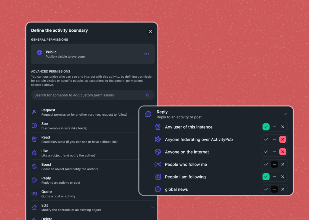 Bonfire is strongly focused on giving people full control over their social networking presence. For the developers, this means continually finding a balance between how to give people access to all the different options, while not overwhelming people. This tension is visible in the UI for creating posts, where people can define the boundaries for who can access and interact with a post on a highly granular detail.